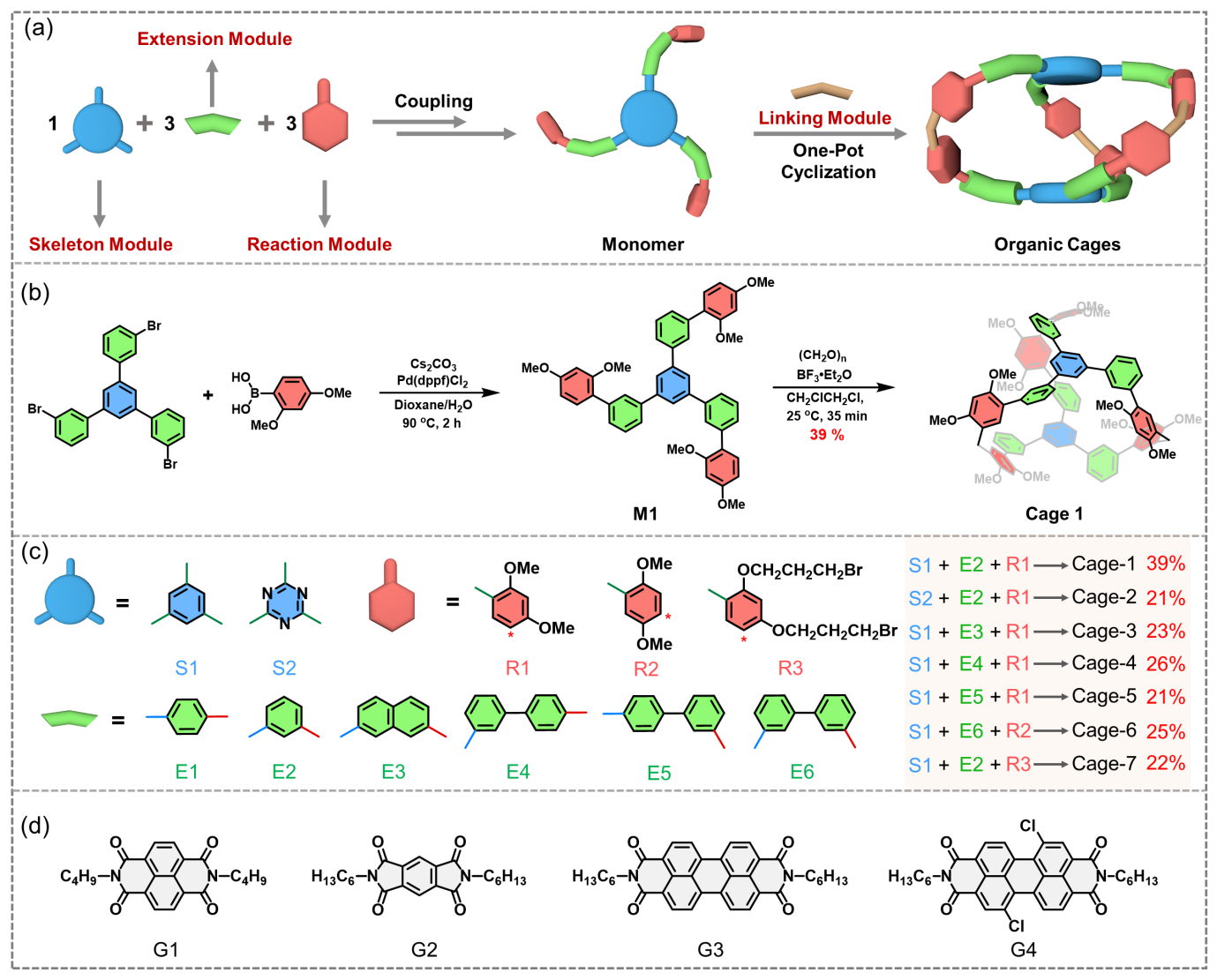 基于以上問題,該團隊提出了一種“模塊化定制合成共價有機分子籠的通用策略”。該方法包含4種模塊,首先,1個中心骨架模塊(S)與3個延伸模塊(E)和3個反應模塊(R)通過一步或兩步簡單的Suzuki?Miyaura偶聯(lián)高效制備具有3個反應活性位點三角形單體,進而單體和連接模塊多聚甲醛在Lewis酸催化下進行一鍋Friedel–Crafts縮合,即可產(chǎn)生所設計的分子籠(圖1)。研究發(fā)現(xiàn)單體結(jié)構中S–E–R連接的角度對成籠至關重要,只有S–E–R角度為120°且2,4-二甲氧基苯作為反應模塊或60°且2,5-二甲氧基苯作為反應模塊時才能成功獲得分子籠。通過合理的設計幾種模塊,成功獲得一系列具有不同功能骨架、空腔尺寸及電性的共價有機籠,并獲得2個分子籠的單晶結(jié)構,實現(xiàn)共價有機籠的可定制合成。此外,中性主體在有機相中高效識別中性客體是十分困難且具有挑戰(zhàn)性的,典型的中心骨架電性不同的分子籠分別對缺電子的中性芳香二亞胺(G1?G4)表現(xiàn)出強的鍵合能力,在極性溶劑最高鍵合常數(shù)達105 M?1,驅(qū)動力主要是疏溶劑效應和電荷轉(zhuǎn)移作用。該工作為化學穩(wěn)定的共價有機籠的合成及功能材料的設計提供了新思路和新方法。