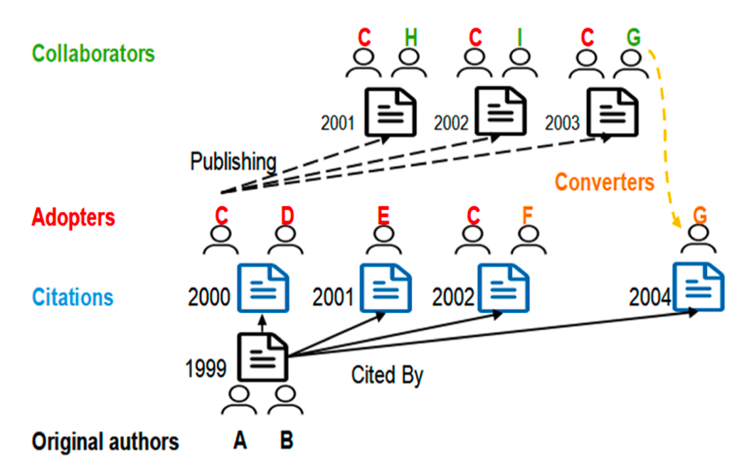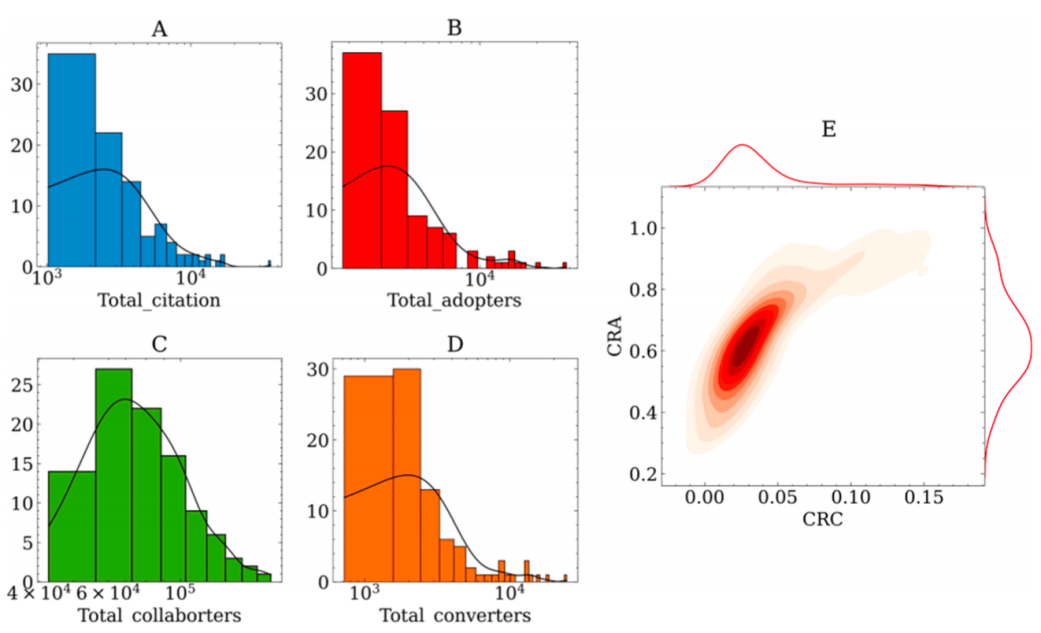 為探究這些問題,研究團隊開創性地將“集體記憶理論”與“創新擴散理論”相融合,構建了基于引用的科學創新集體記憶網絡,并在網絡中定義了四類作者角色:原作者、采納者、合作者和轉化者。同時,研究引入了兩個新的定量指標——采納者轉化率 (CRA) 和合作者轉化率 (CRC),用于衡量合作網絡中知識傳遞的效率。通過對引用模式、合作網絡及轉化率的綜合分析,團隊揭示了科學創新在合作網絡中的傳播路徑與內在機制。