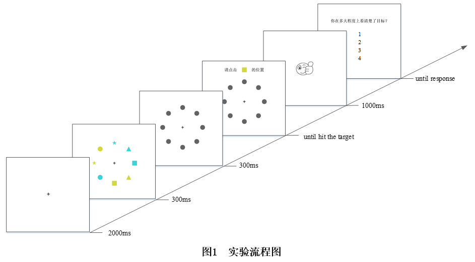 視覺覺知是否能夠以概率性的表征形式存在是意識研究領域中一個具有爭議性的重要問題。為了對該問題進行檢驗,需要突破以往較為常用的二元迫選(binary alternative-forced choice)的實驗范式。呂勇教授等借鑒Wu和Wolfe(2018)在多目標追蹤范式中創新性的反應方法,使用matlab編寫實驗程序。該程序首先呈現多個目標,然后用灰色的圓覆蓋目標。接下來,會隨機呈現多個目標中的一個,要求參與者點擊該目標的位置。參與者可進行多次點擊,直到找到目標為止。重要的是,參與者要用盡可能少的點擊次數找到目標。最后,參與者需使用感知覺知量表回答對目標的覺知水平。