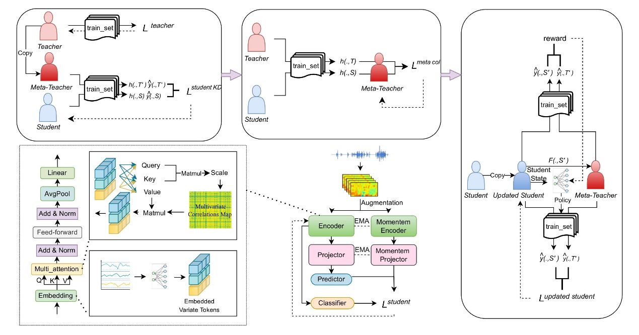 Transformer作為深度學習中的重要架構,憑借其強大的長序列依賴建模能力,在自然語言處理、計算機視覺等多個領域得到了廣泛應用。然而,當前的Transformer架構在語音情感識別任務中表現欠佳,這主要是由于未對齊的時間戳以及不同變量間物理測量的差異,會導致注意力機制的無意義映射。同時,Transformer架構包含大量參數,需要消耗大量的計算資源,這使其難以在資源有限的環境中部署。此外,人類情感具有復雜性和模糊性,而現有的Transformer架構難以有效處理這種復雜的情感信息。為此,研究團隊提出了一種知識蒸餾框架。具體而言,研究團隊首先對教師模型進行微調,使其能夠適應不同的語音情感識別任務。在學生模型中,將單個序列時間點嵌入到變量標記中,以此聚合全局語音表示。同時,結合監督對比損失和交叉熵損失,以增大可學習特征之間的類間距離。最后,采用元知識蒸餾與基于課程的知識蒸餾方法,提升學生模型的性能。實驗結果驗證了該方法的有效性。這一成果為推動語音情感識別領域的進一步發展提供了新的理論框架。