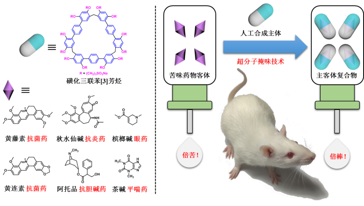 隨著人民生活水平的不斷提高,對臨床治療藥物的順應性愈發重視,其中口感問題尤為突出??辔兑虺掷m時間長、感知閾低等特征被視為最厭惡的味覺。眾多藥用活性成分具有不同程度的苦味而致難以吞咽,嚴重限制了口服制劑的發展與臨床應用,亟需開發新型掩味技術來解決此難題。在本研究中,作者以磺化三聯苯[3]芳烴為合成受體,通過超分子作用高效絡合多種生物堿類藥物進行掩味,該大環化合物具有良好的水溶性、生物相容性和刺激響應性,適用于口服給藥且有利于在胃腸道中定點釋放,形成的復合物有效地維持了原藥的生物活性。