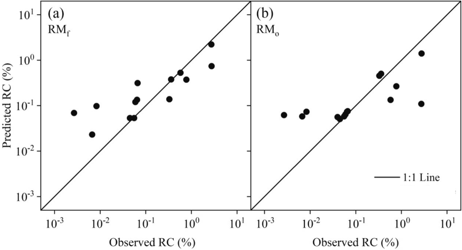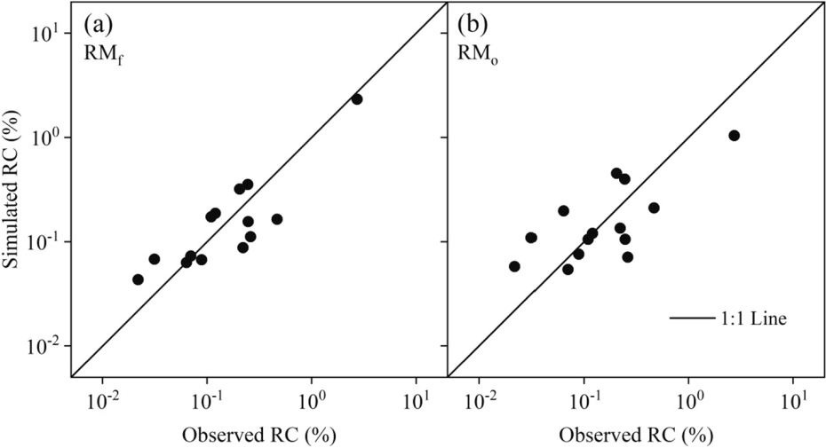 圖2 徑流系數(shù)(RC)觀測(cè)值和擬合值的比較,RMf表示考慮降雨波動(dòng)回歸模型,