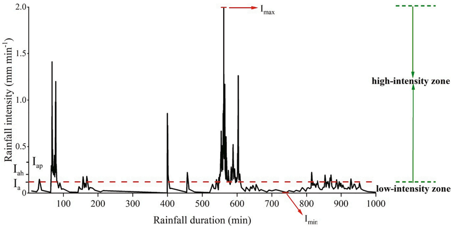 黃土高原是黃河泥沙的主要來源,嚴(yán)重的水土流失引起一系列生態(tài)環(huán)境和社會(huì)經(jīng)濟(jì)問題。降雨是引起黃土高原坡面水土流失的主要驅(qū)動(dòng)力,以往研究通常只關(guān)注于降雨事件發(fā)生的降雨量、歷時(shí)、平均雨強(qiáng)和最大30min雨強(qiáng)等常規(guī)特征對(duì)產(chǎn)流和產(chǎn)沙的影響,忽略了降雨過程中雨強(qiáng)的波動(dòng)特征對(duì)水土流失的影響。隨著氣候變化加劇,導(dǎo)致強(qiáng)降雨事件頻發(fā),降雨強(qiáng)度波動(dòng)特征的復(fù)雜性成為制約降雨與水土流失關(guān)系研究的熱點(diǎn)和難點(diǎn)問題。為此,本研究在黃土高原地區(qū)開展野外水土流失觀測(cè)實(shí)驗(yàn),通過解析降雨事件雨強(qiáng)波動(dòng)過程(圖1),建立了一系列降雨強(qiáng)度波動(dòng)特征指數(shù),從而量化降雨強(qiáng)度波動(dòng)特征對(duì)水土流失的影響。