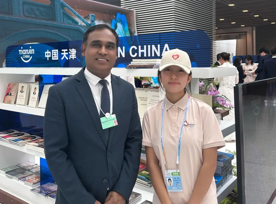 在論壇文化展區(qū),志愿者們化身“文化使者”,為中外嘉賓精選人文社科、經(jīng)濟(jì)科技等領(lǐng)域的經(jīng)典著作。外事采訪口譯崗位上,志愿者們憑借扎實(shí)的雙語功底和跨文化溝通能力,協(xié)助中外媒體完成多場(chǎng)訪談。在攝影記者和采訪媒體身旁,志愿者們提前熟悉拍攝流程和場(chǎng)地布局,快速協(xié)調(diào)機(jī)位、疏導(dǎo)人群,為記者創(chuàng)造最佳拍攝條件。他們的專業(yè)素養(yǎng)和應(yīng)變能力,確保了一個(gè)個(gè)精彩瞬間被完美定格。在南開大學(xué)停車場(chǎng)接駁點(diǎn)和會(huì)場(chǎng)之間,志愿者們輪班值守,頂著烈日引導(dǎo)車輛、協(xié)助嘉賓乘車,高效完成嘉賓接送、車輛調(diào)度、應(yīng)急保障等工作。我校志愿者們以最真摯的微笑傳遞城市溫度,用最專業(yè)的服務(wù)詮釋青春擔(dān)當(dāng)。在每一個(gè)平凡崗位綻放非凡光彩,向世界繪就新時(shí)代天津青年的精神畫卷。