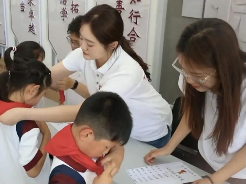 能力提升:錘煉教書育人本領研支團成員們前往天津師范大學附屬實驗學校開展為期五個月的沉浸式教學實習,通過跟班聽課備課、課堂實戰試講、班級精細化管理等環節,成員們在一線教學的熔爐中,系統掌握了提升課堂效能、優化教學方法、構建和諧師生關系、強化班級凝聚力的核心技能。實習期間,研支團創新實踐“團建帶隊建”模式,精心策劃開展“紅領巾心向黨?團徽閃耀助成長”隊前教育系列活動,特別是面向一年級新生設計的“入隊知識大闖關”和常態化的“紅領巾小課堂”,成為培育少先隊員行為規范、厚植愛黨愛國情懷的重要載體,讓紅色基因和黨團隊一脈相承的信念在幼小心靈中生根發芽。這段寶貴的實習經歷,為成員們奔赴西部講臺施展才華打下了不可替代的實踐基礎。